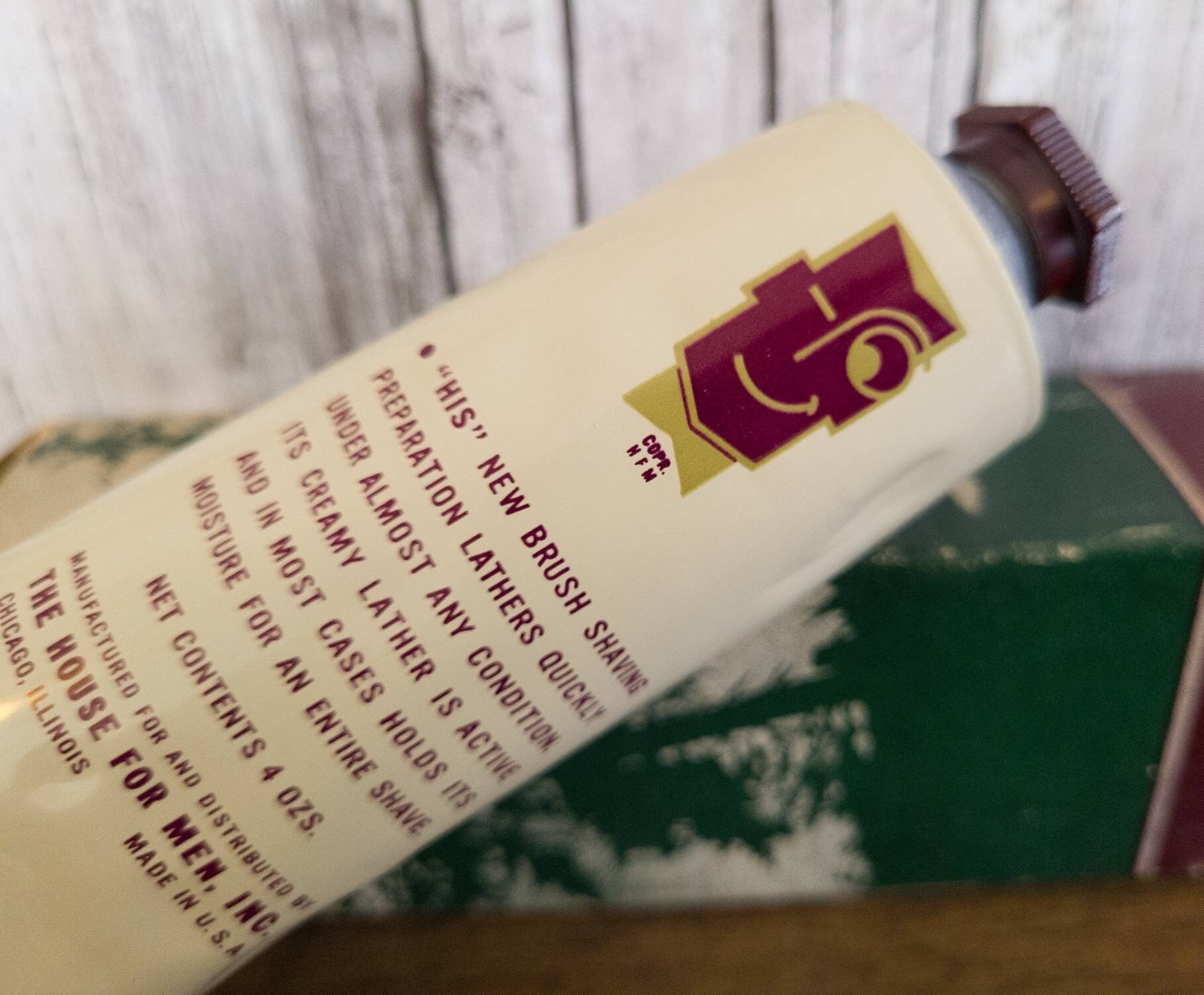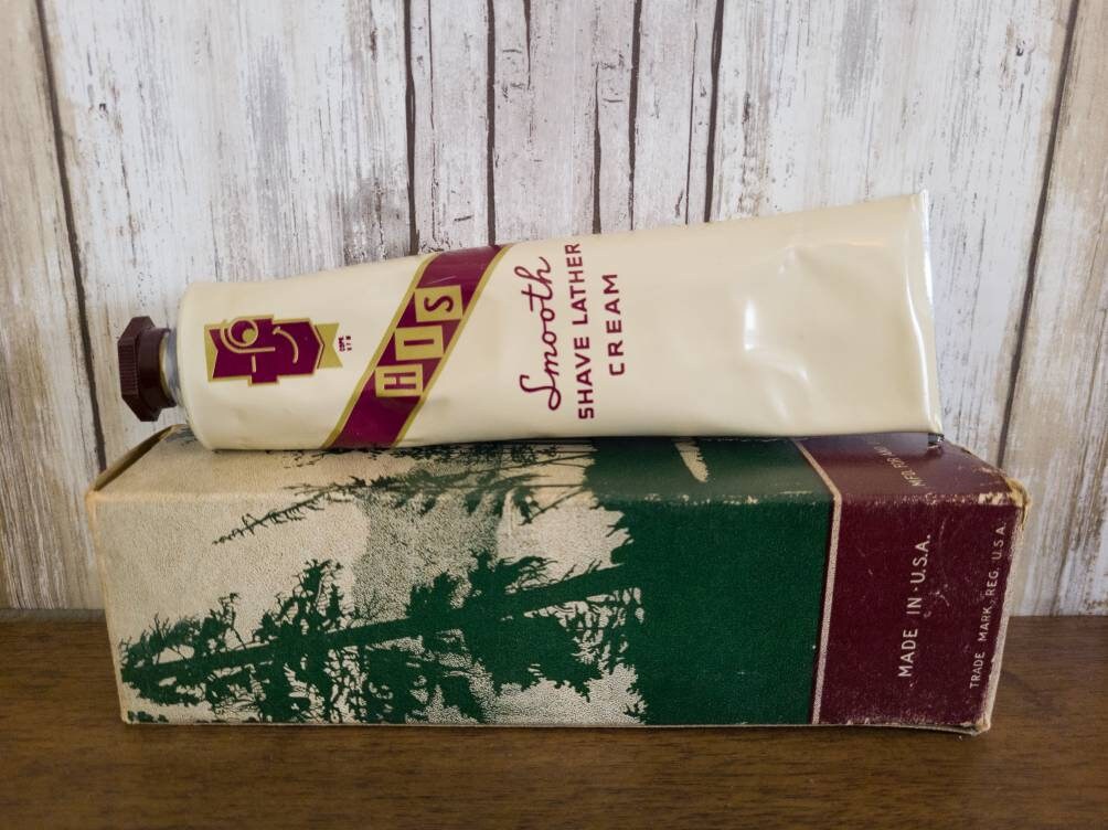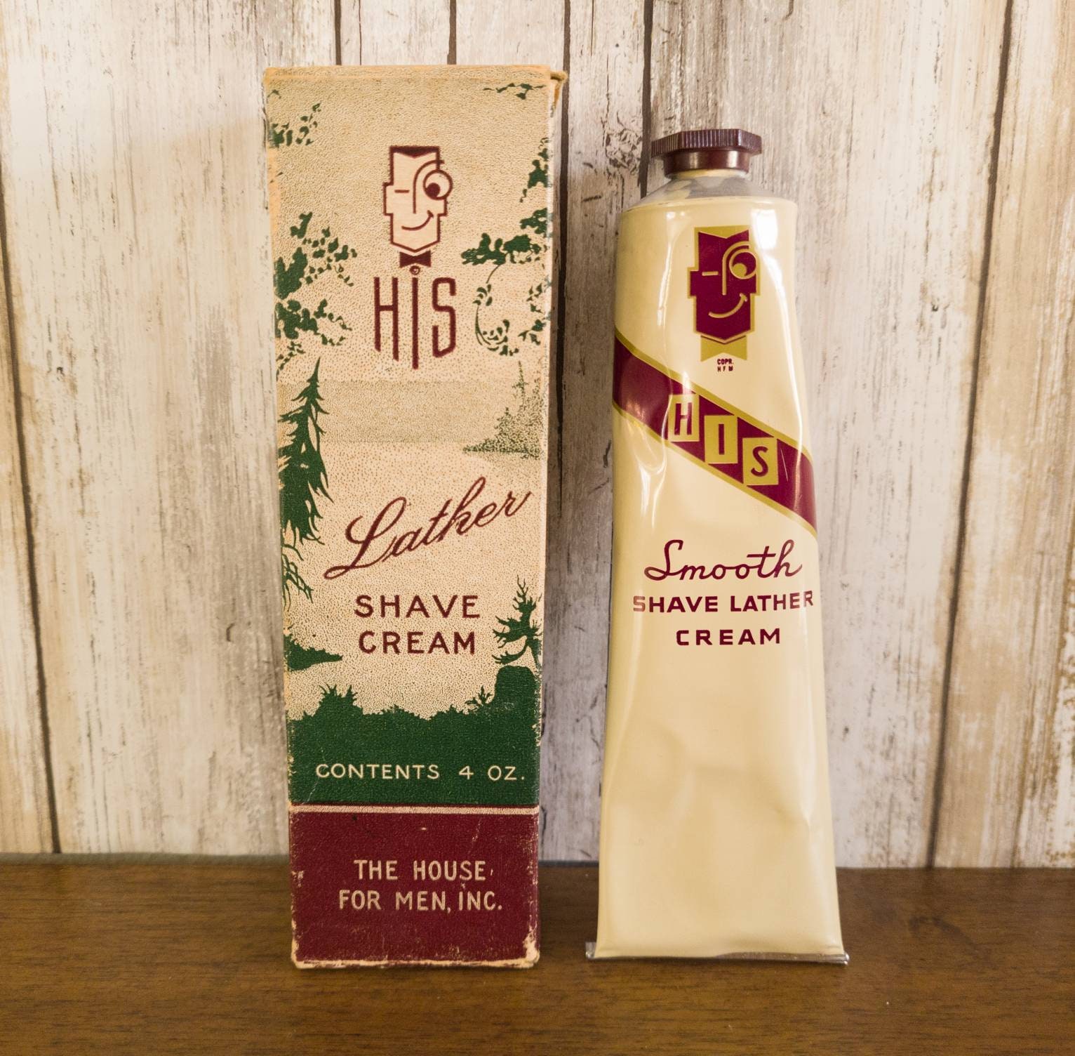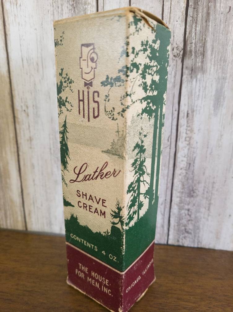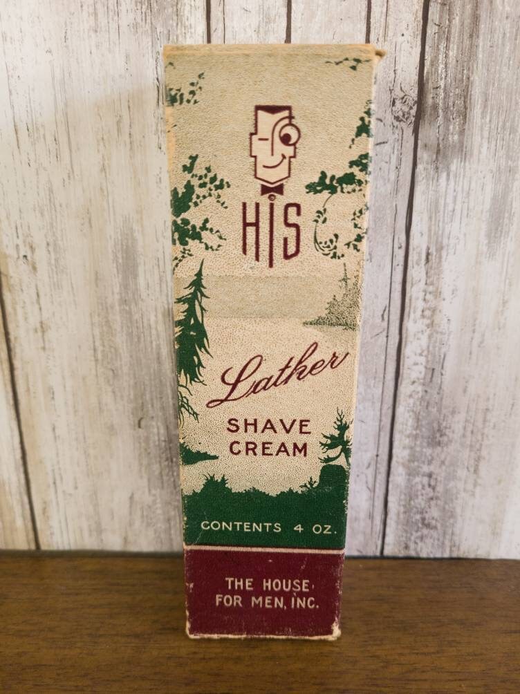 Kitschy and cool gift for guys with retro flair! This box and matching tube of HIS SHAVE CREAM will look great on a bathroom shelf or men's dresser. Likely from the 50's, the product packaging has so much vintage charm.