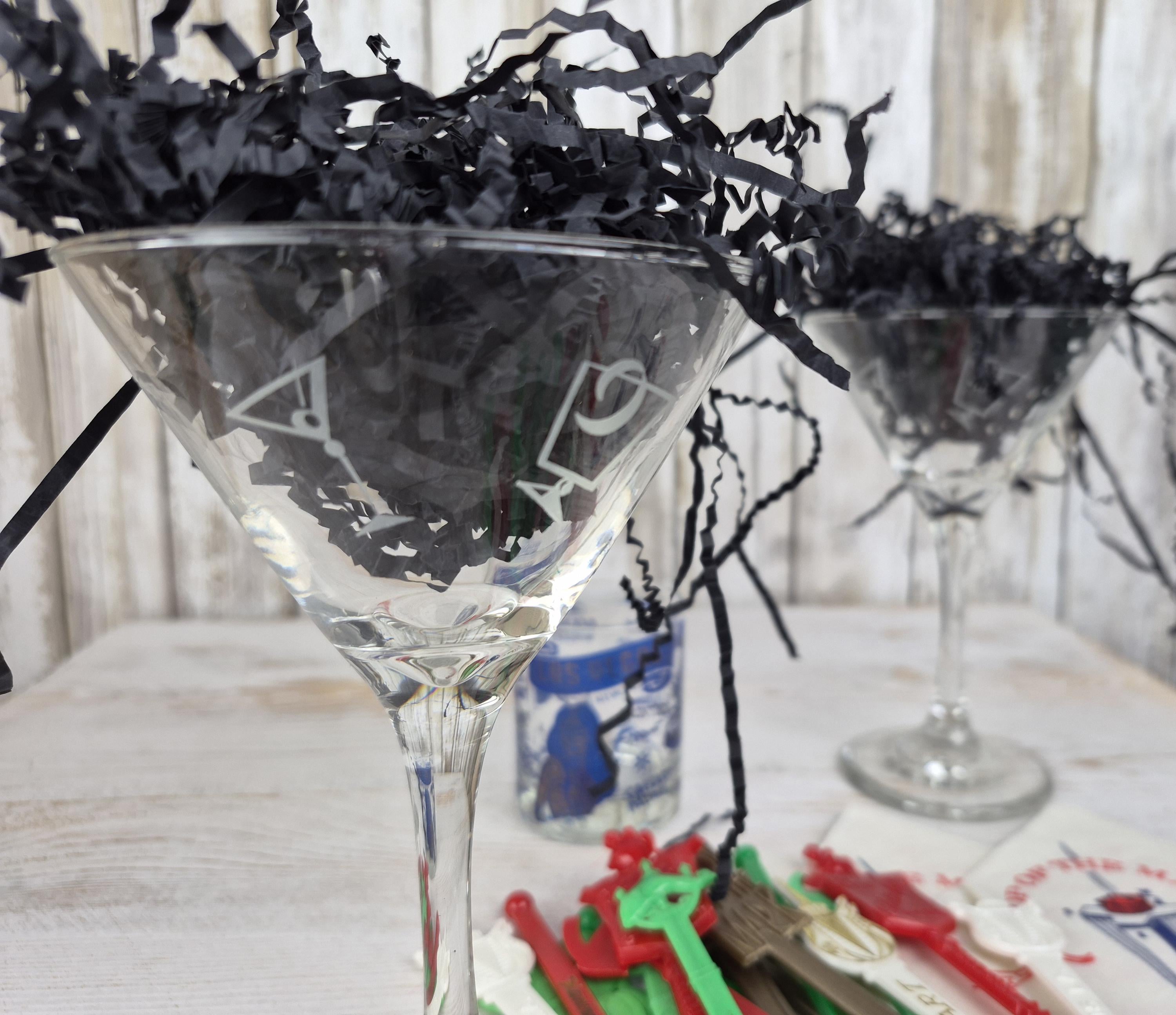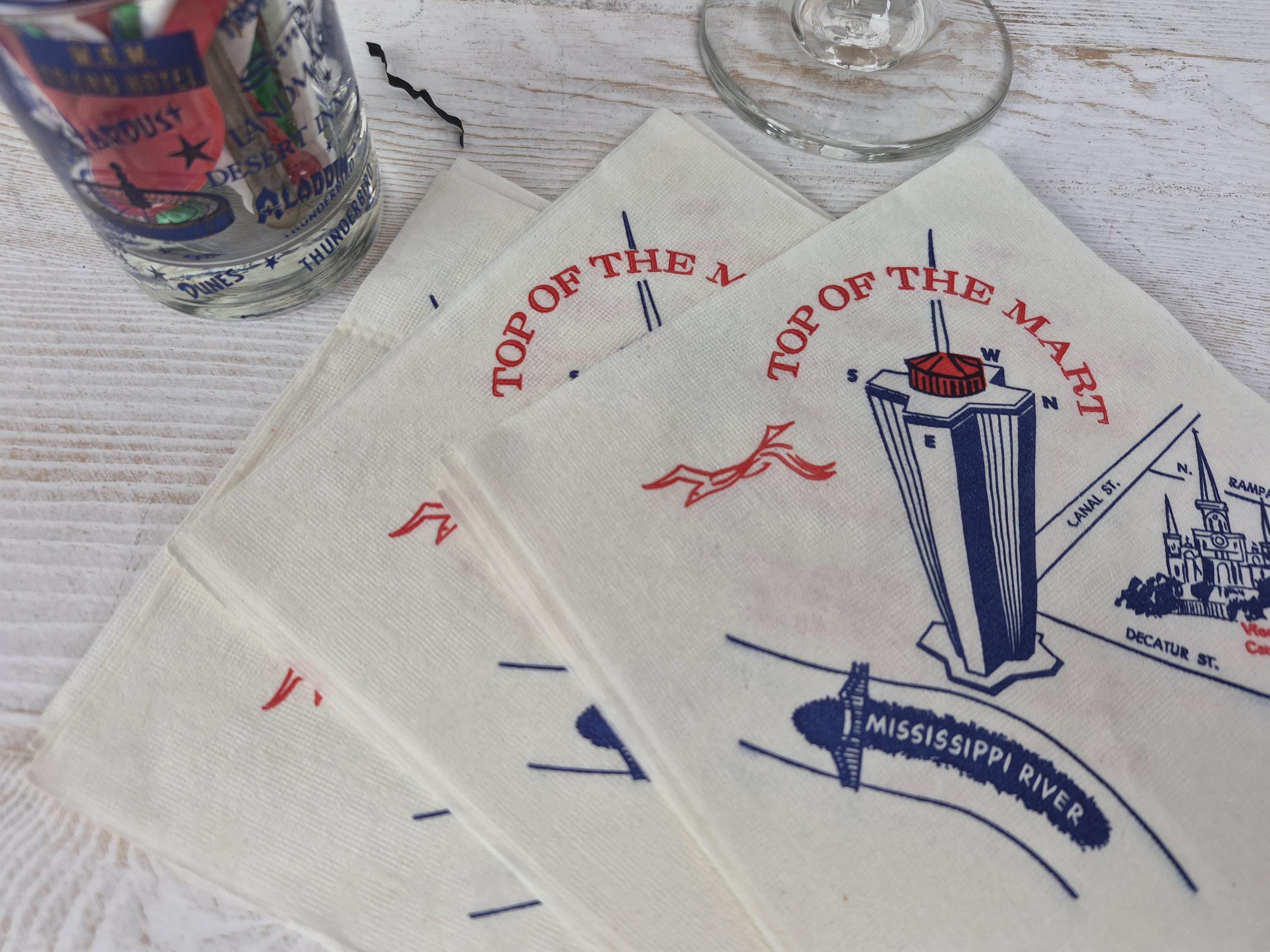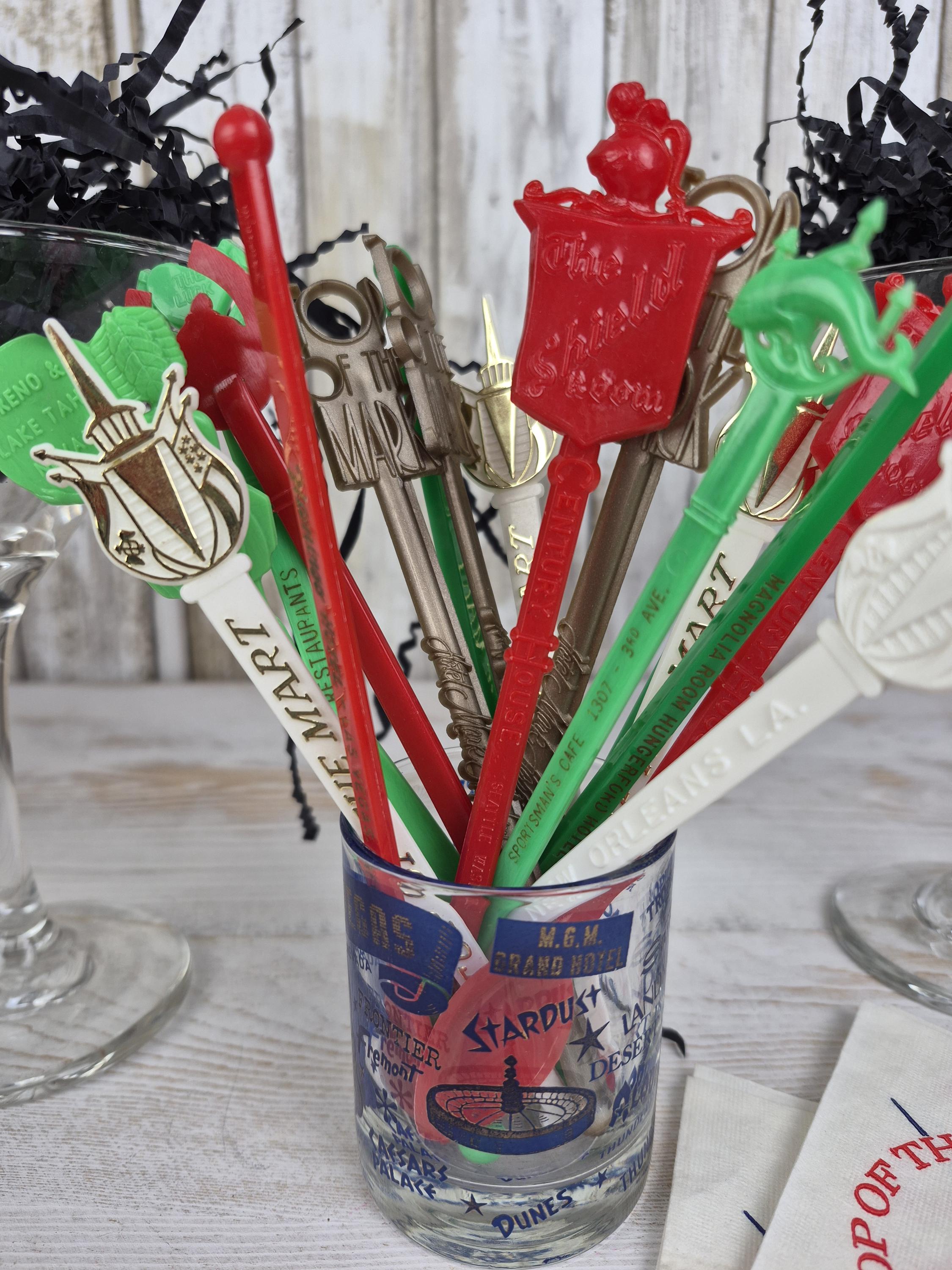Add some mid-century retro cool to your bar with this bundle of vintage goodies! Includes two tall martini glasses with an etched "cocktail shaker & olive martini design" around the glass, a vintage Las Vegas shot glass, a great variety of vintage cocktail swizzle sticks from various restaurants and bars, and a few vintage napkins from "the Top of the Mark" New Orleans. Fun set! All from the 1950s / 1960s and in excellent shape for their age. Instantly will add color and pizazz to your cocktail hour!