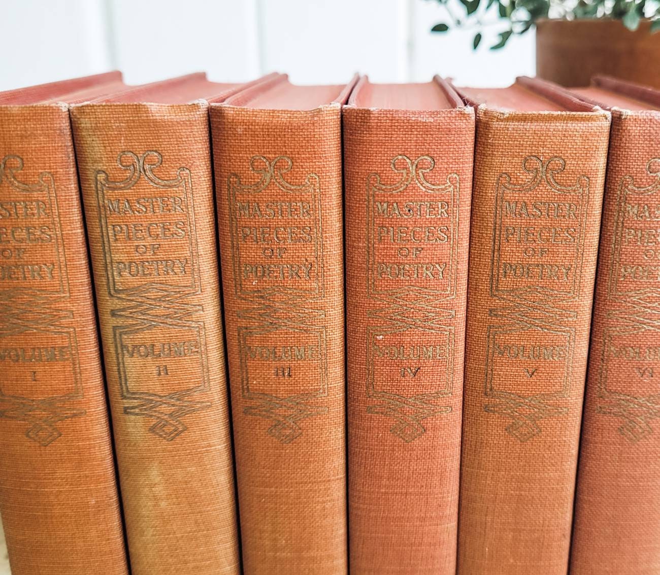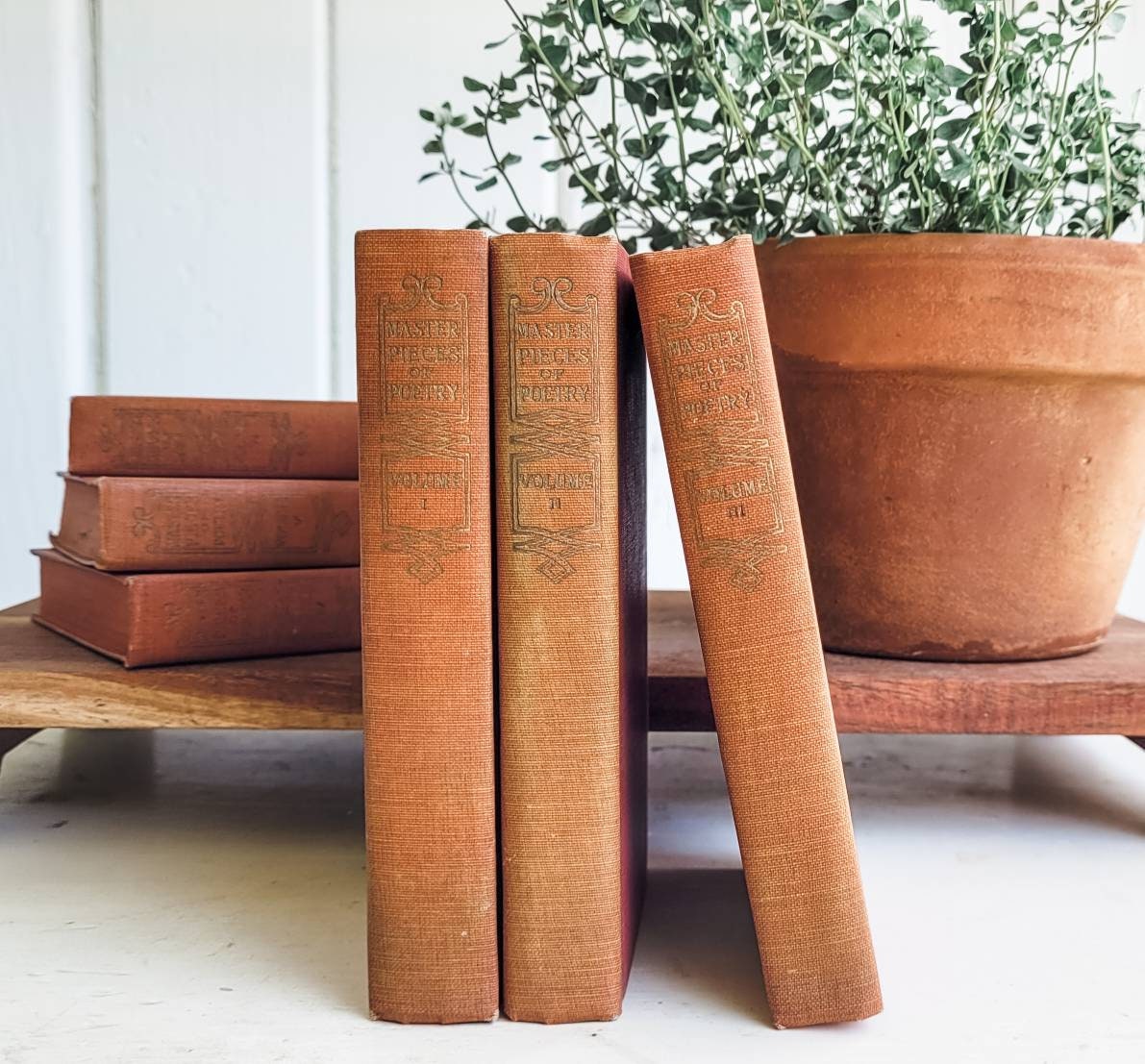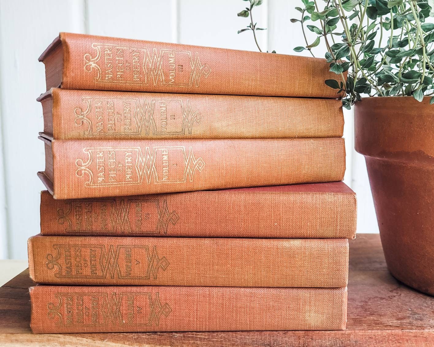 Add charm to your display with this bundle of ANTIQUE MINIATURE BOOKS! Six volume set of 'Masterpieces of Poetry' books with warm rust colored (reddish-orange brown) covers and faded gold lettering on the spines. These small books are from the early 1900's and are in great shape for their age - very minor scuffing and age discoloration that gives them character.
