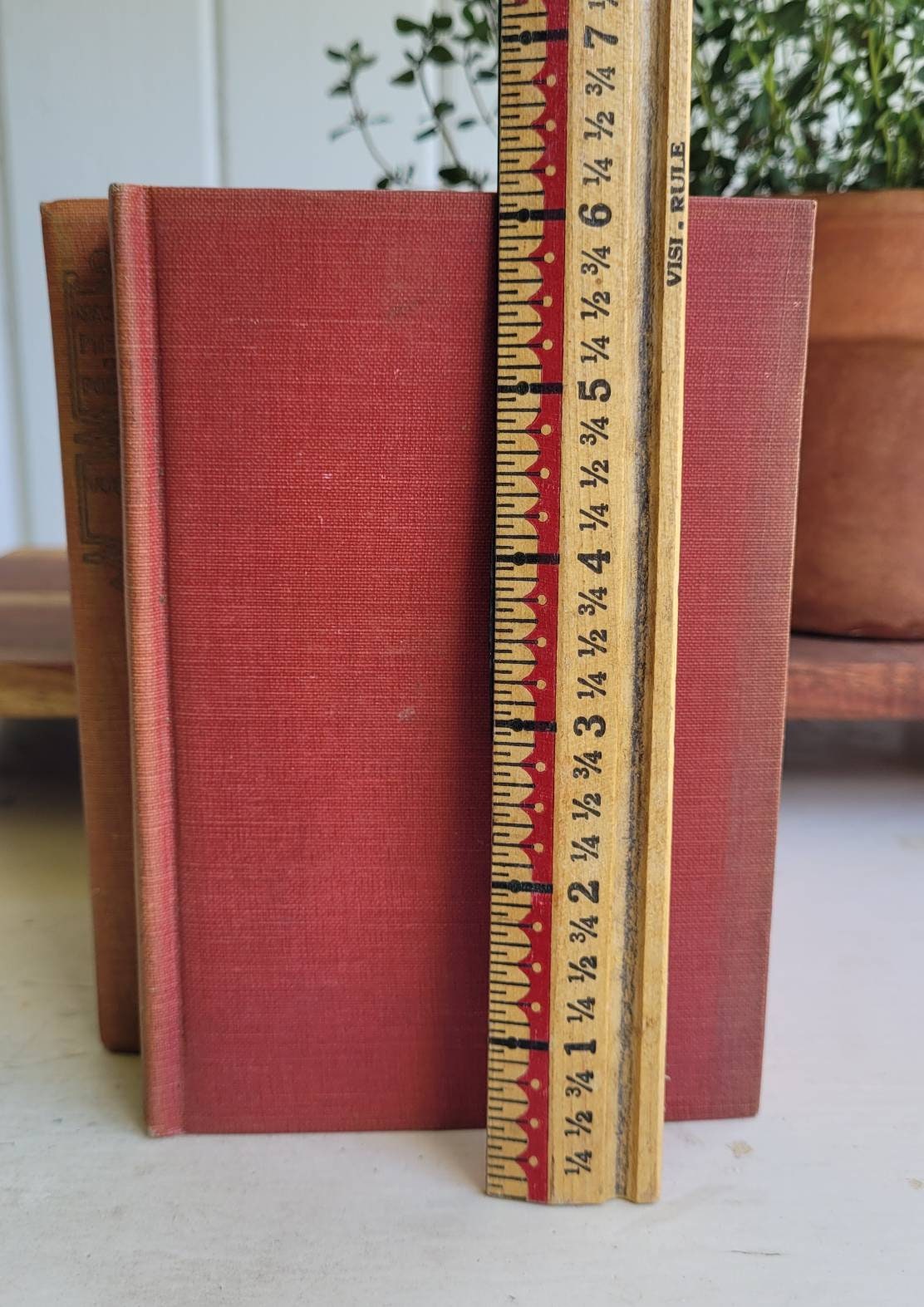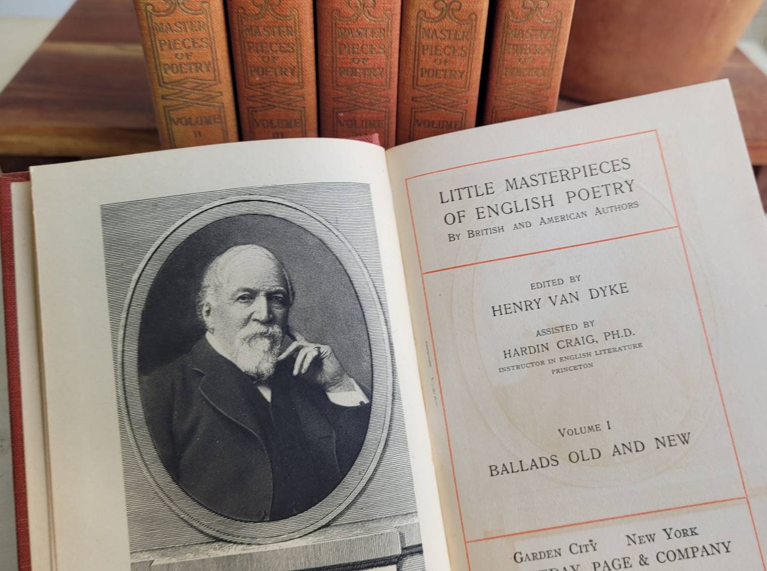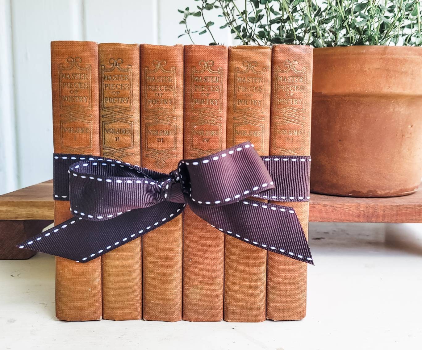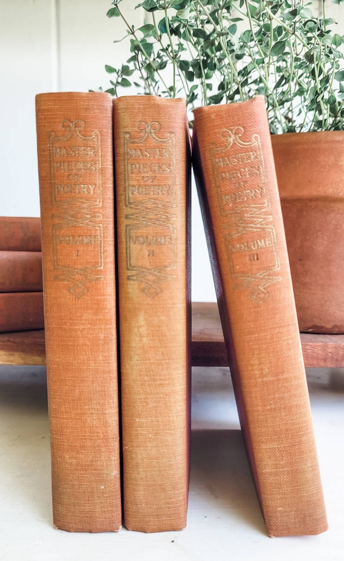 Add charm to your display with this bundle of ANTIQUE MINIATURE BOOKS! Six volume set of 'Masterpieces of Poetry' books with warm rust colored (reddish-orange brown) covers and faded gold lettering on the spines. These small books are from the early 1900's and are in great shape for their age - very minor scuffing and age discoloration that gives them character.