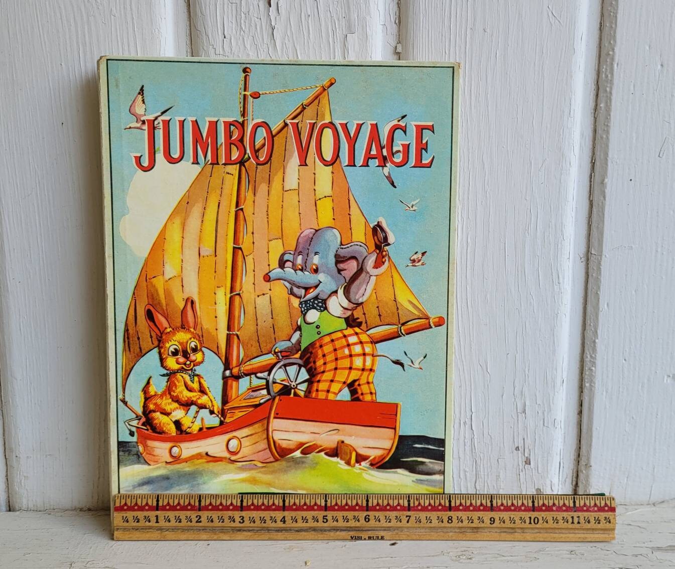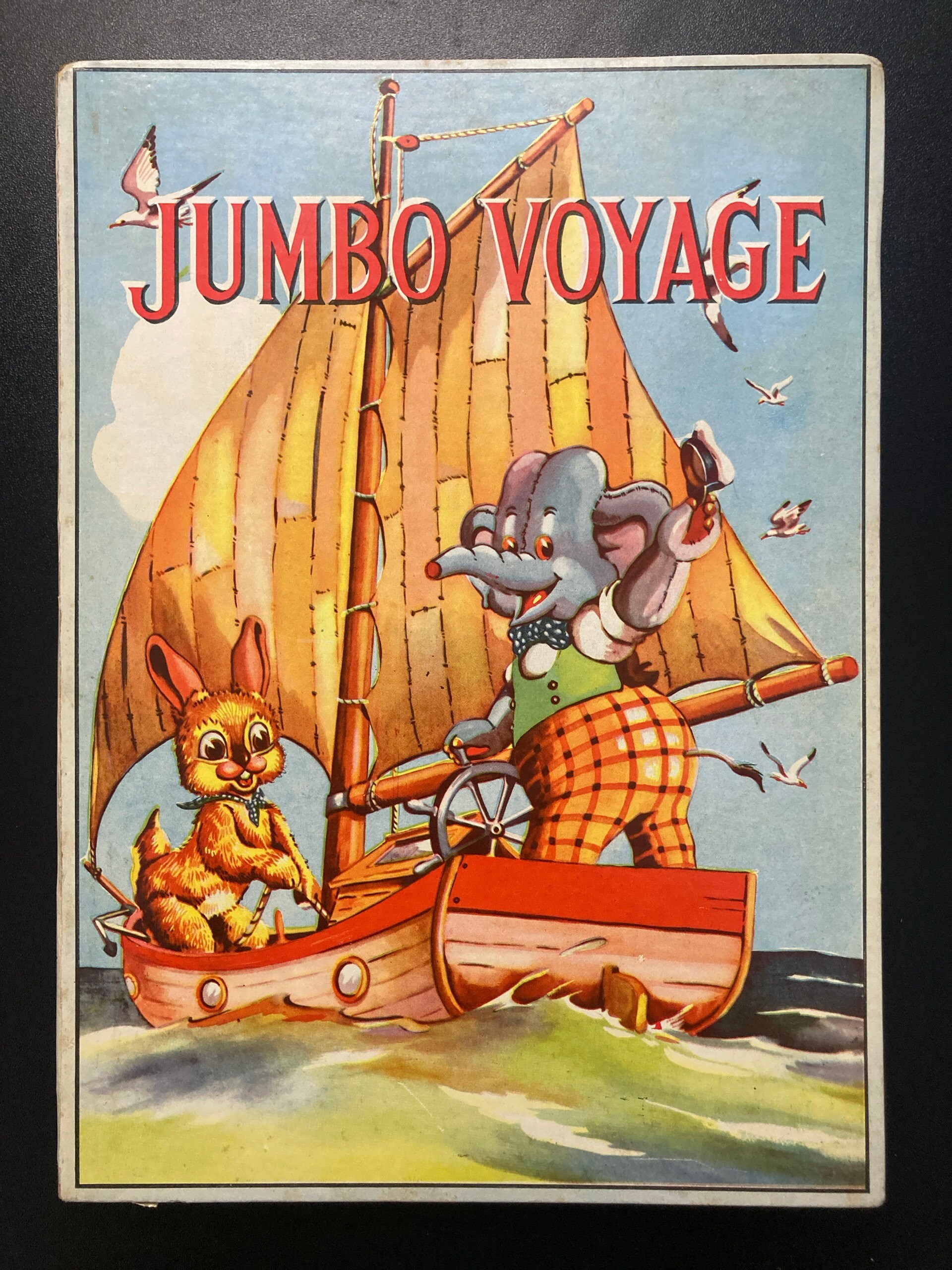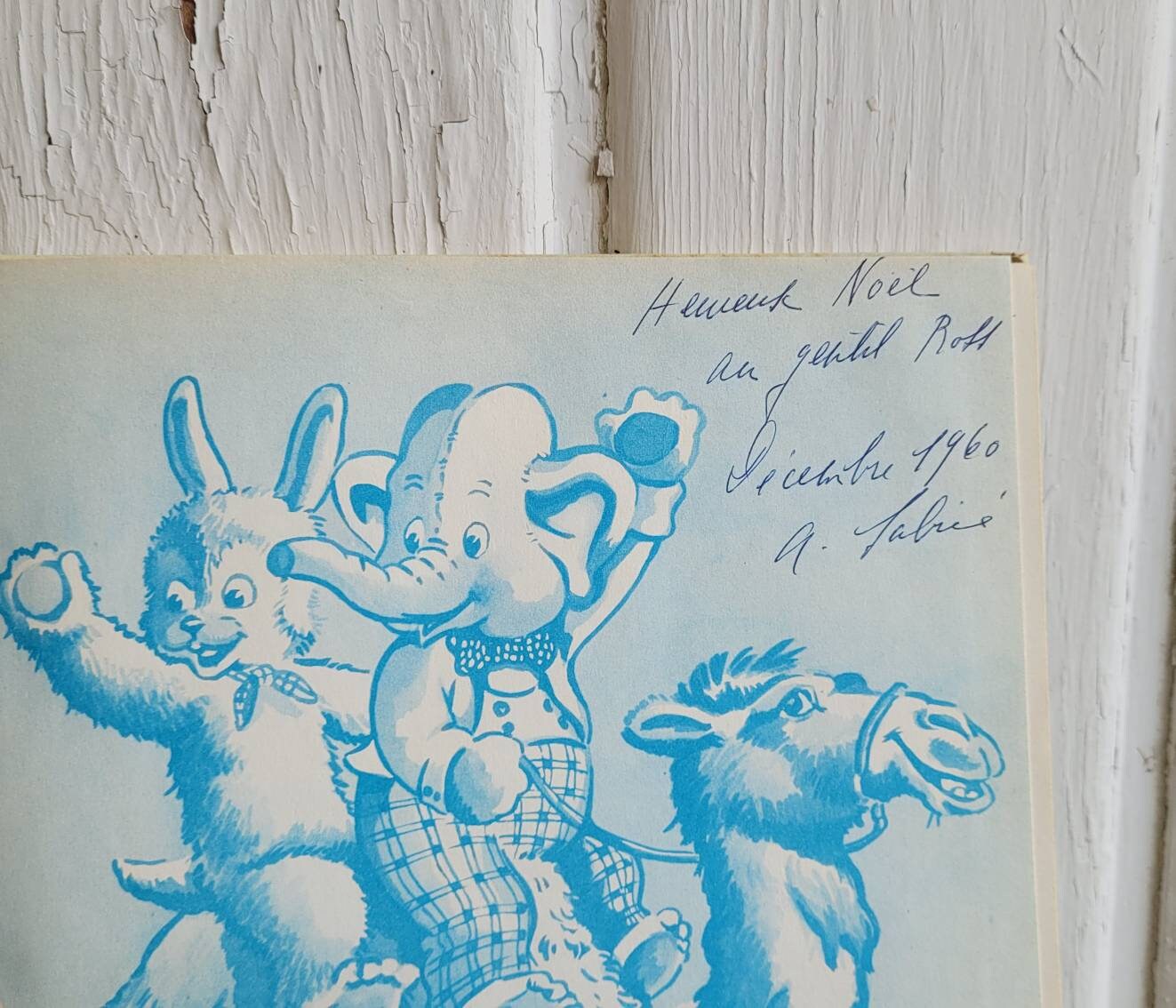 This vintage French language children's book is simply precious! The graphics on the cover are just the beginning; the adorable illustrations continue throughout. Called JUMBO VOYAGE the story features a smiling well-dressed Elephant and his Bunny Rabbit friend.