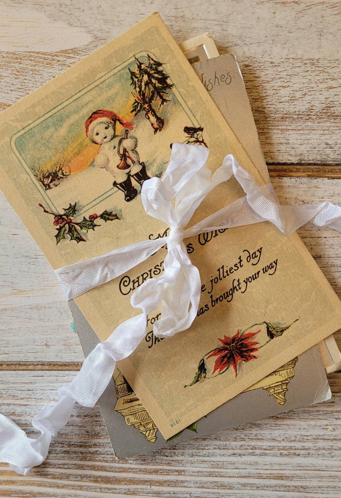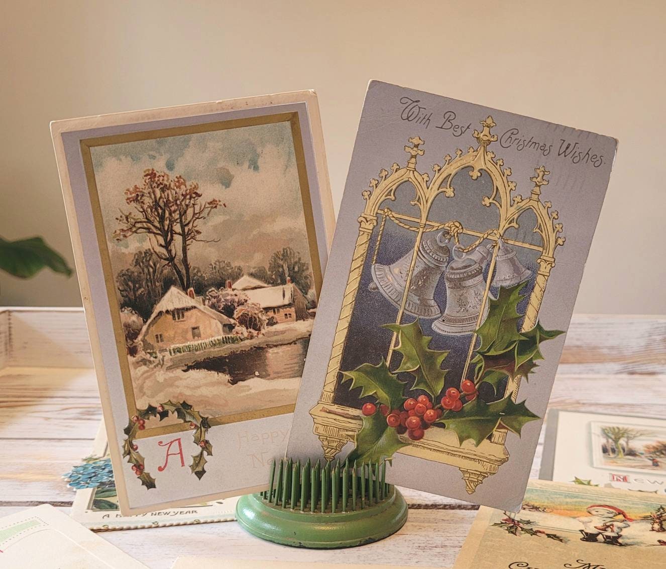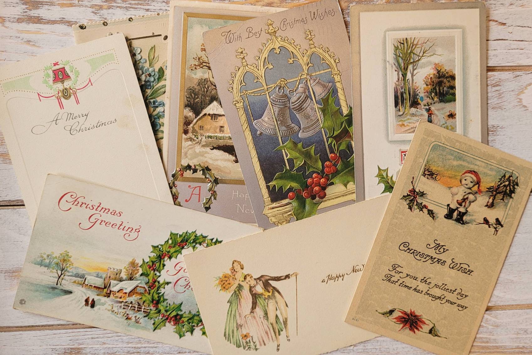 Bundle of beautiful ANTIQUE CHRISTMAS & NEW YEAR GREETING POSTCARDS from the early 1900's. There are 8 cards in the bundle, all different (no duplicates). They are perfectly aged. A couple are unused but most are USED with delightful postmarks and stamps adding to their charm. Wonderful variety of styles. Comes wrapped in a crinkly French ribbon. Lovely old ephemera for desk decor or to use in scrapbooking, journal, or paper crafts.