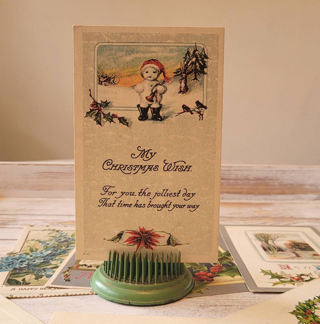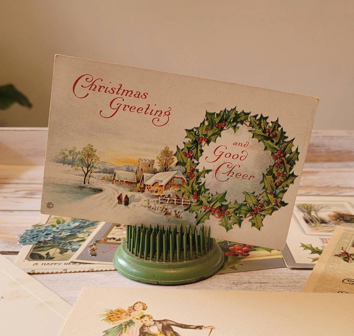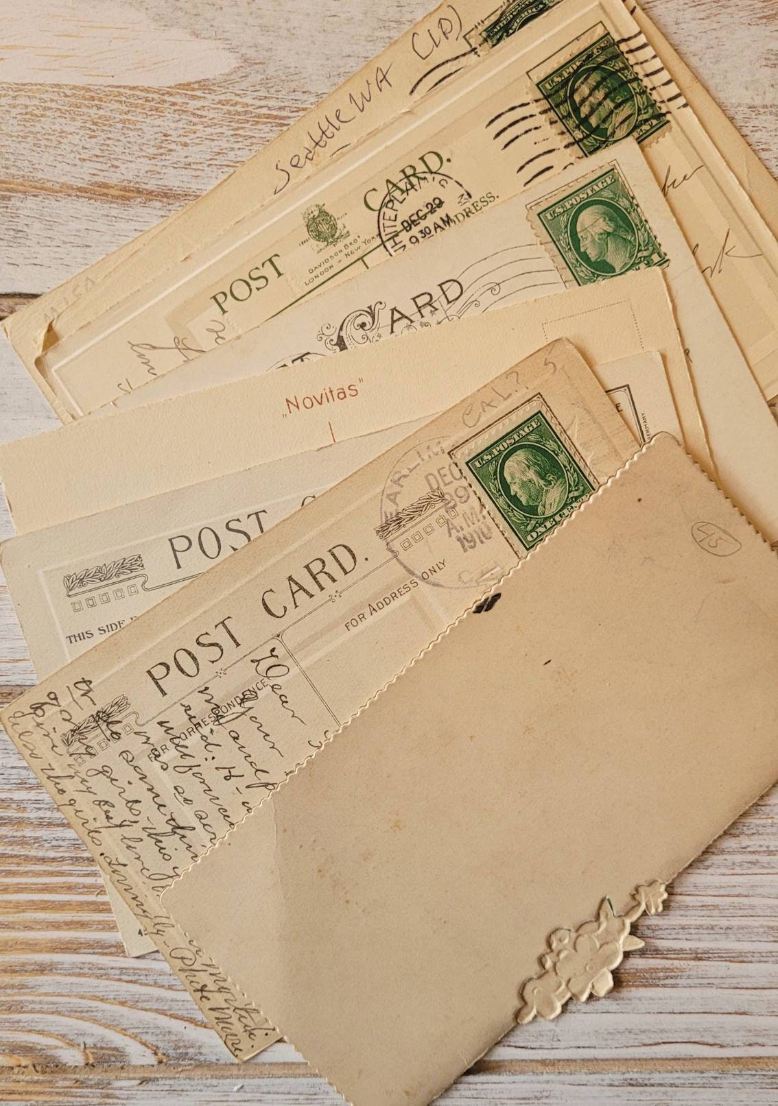 Bundle of beautiful ANTIQUE CHRISTMAS & NEW YEAR GREETING POSTCARDS from the early 1900's. There are 8 cards in the bundle, all different (no duplicates). They are perfectly aged. A couple are unused but most are USED with delightful postmarks and stamps adding to their charm. Wonderful variety of styles. Comes wrapped in a crinkly French ribbon. Lovely old ephemera for desk decor or to use in scrapbooking, journal, or paper crafts.