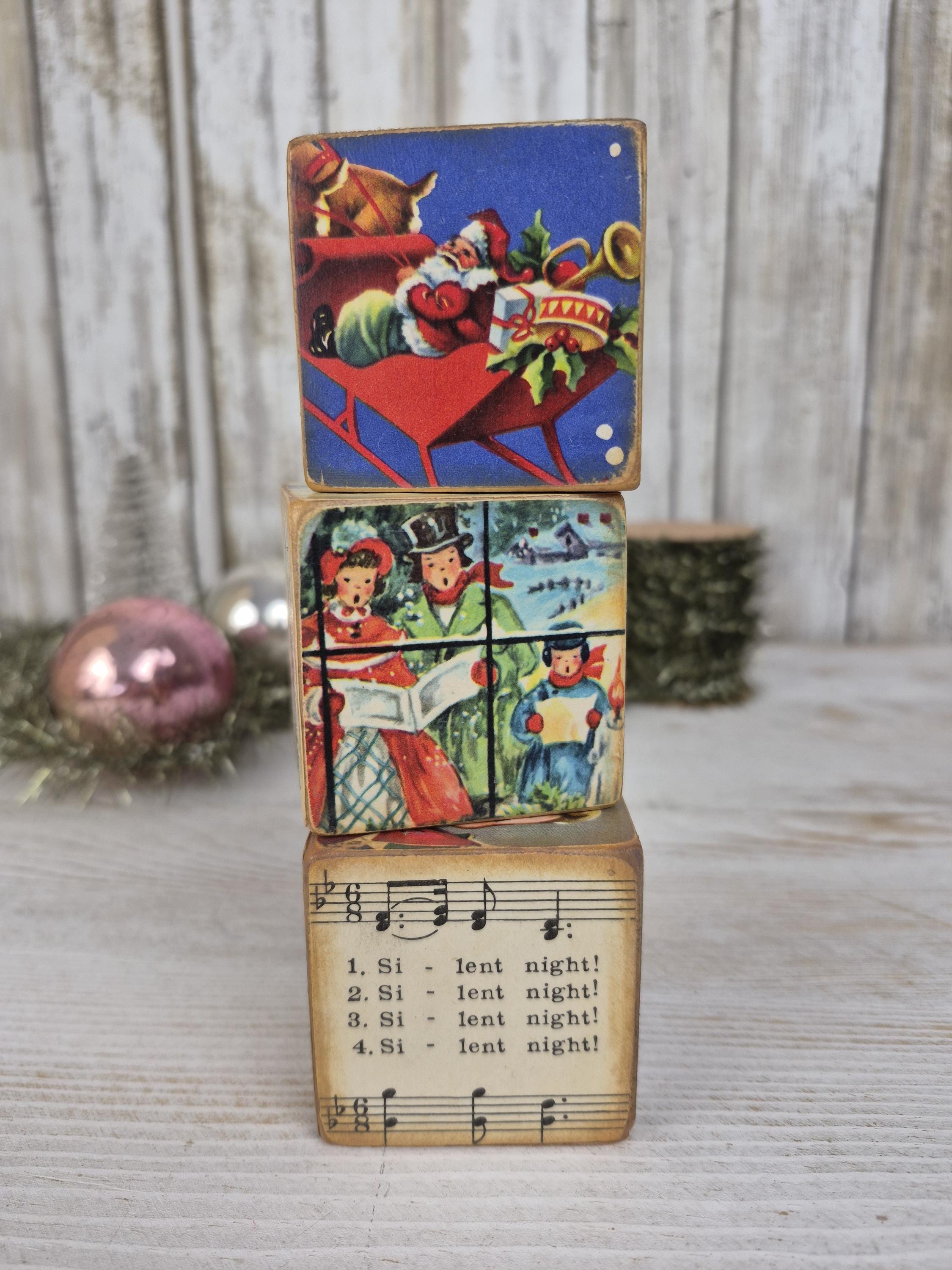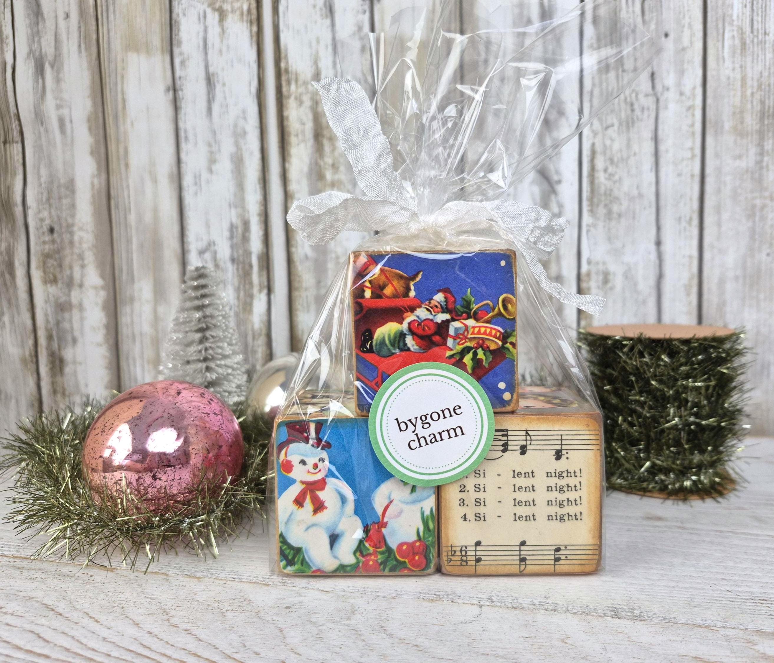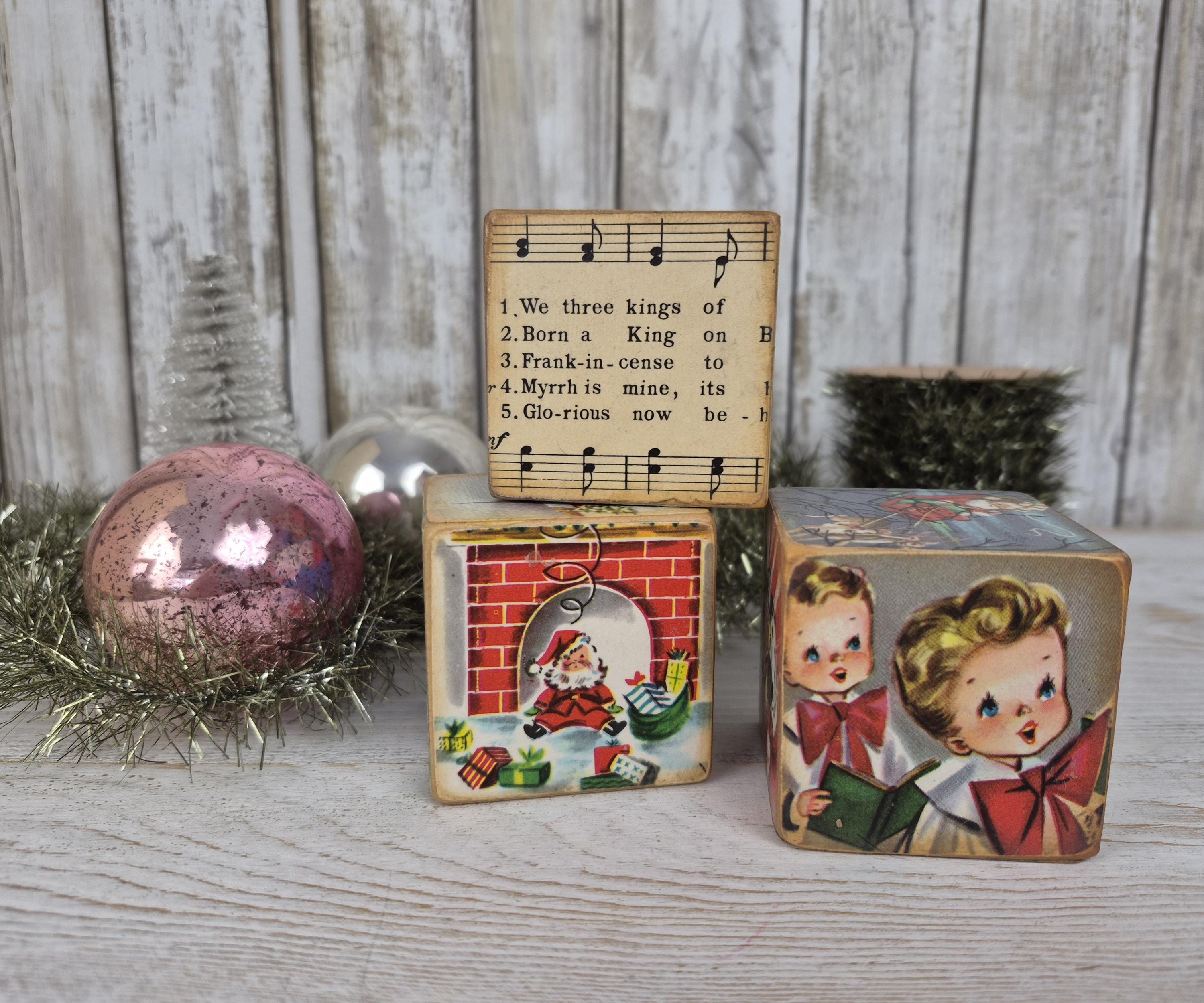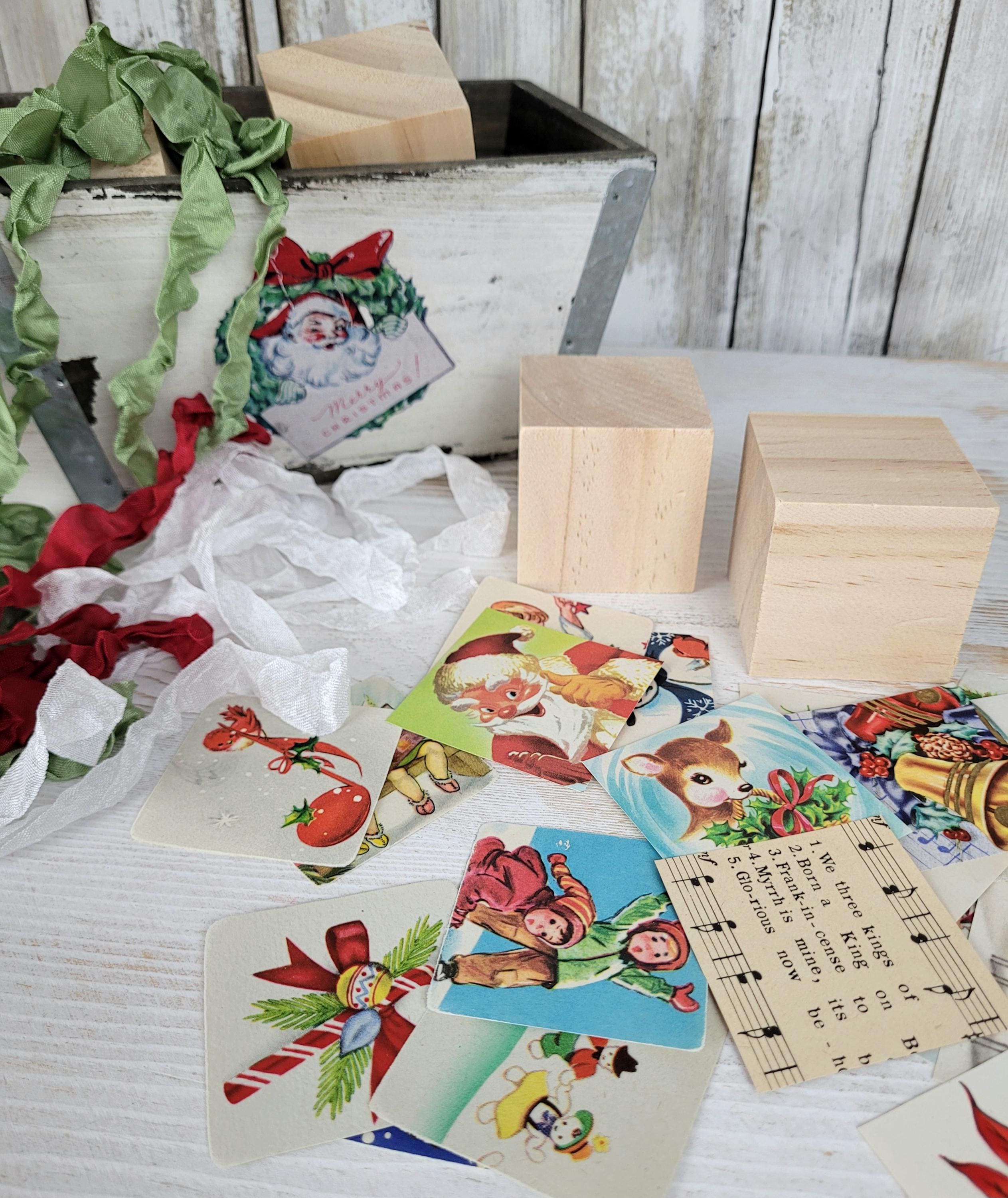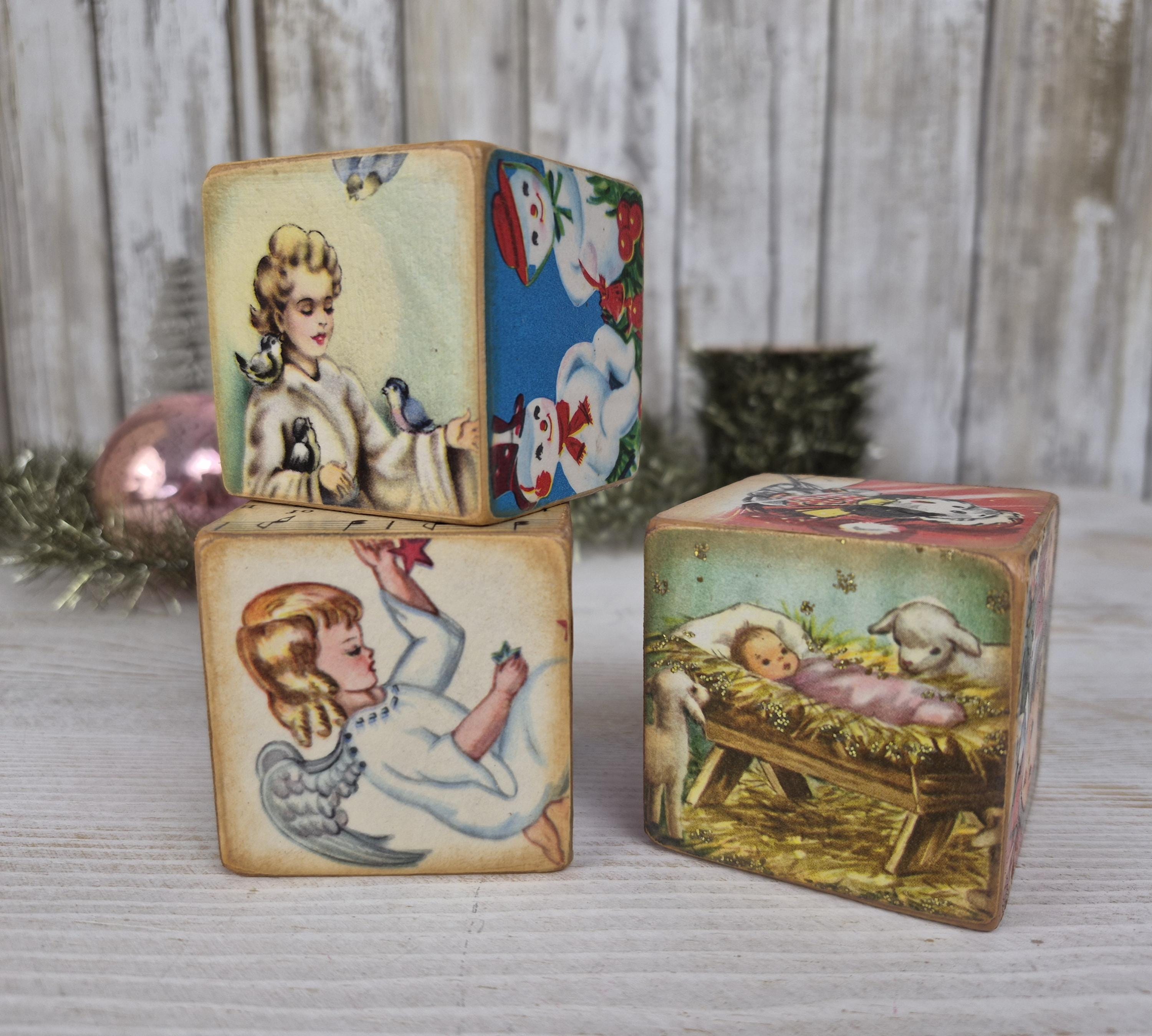 One-of-a-kind Christmas kitsch!! These handcrafted wooden toy blocks are lovingly adorned with authentic vintage ephemera from my personal collection (from the 1930s-1960s). Each block is a tiny vignette—a charming blend of illustrations—creating an heirloom piece with a spirit all its own. Just like the mementos of bygone days, no two are ever alike. Easily add a touch of cheer and timeless charm to your holiday décor!