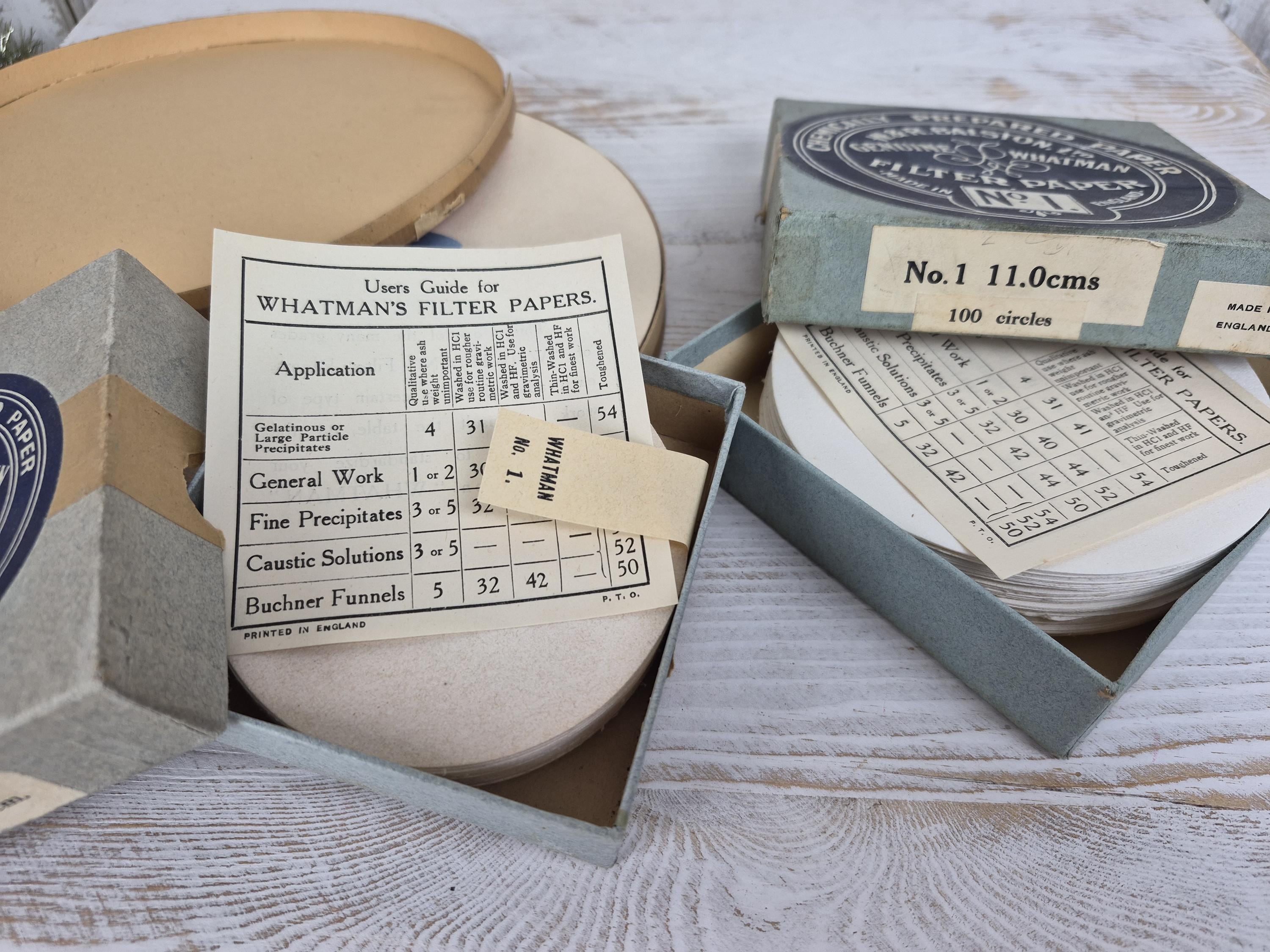 Rare ephemera! Stunning graphics and lettering on these antique packages of chemist filter paper! All of the packages contain the original product. Great addition to a medical/science-themed vintage display. Includes all three boxes as pictured. Dimensions vary. Items show some wear & tear from age: stains, scuffs and discoloration.