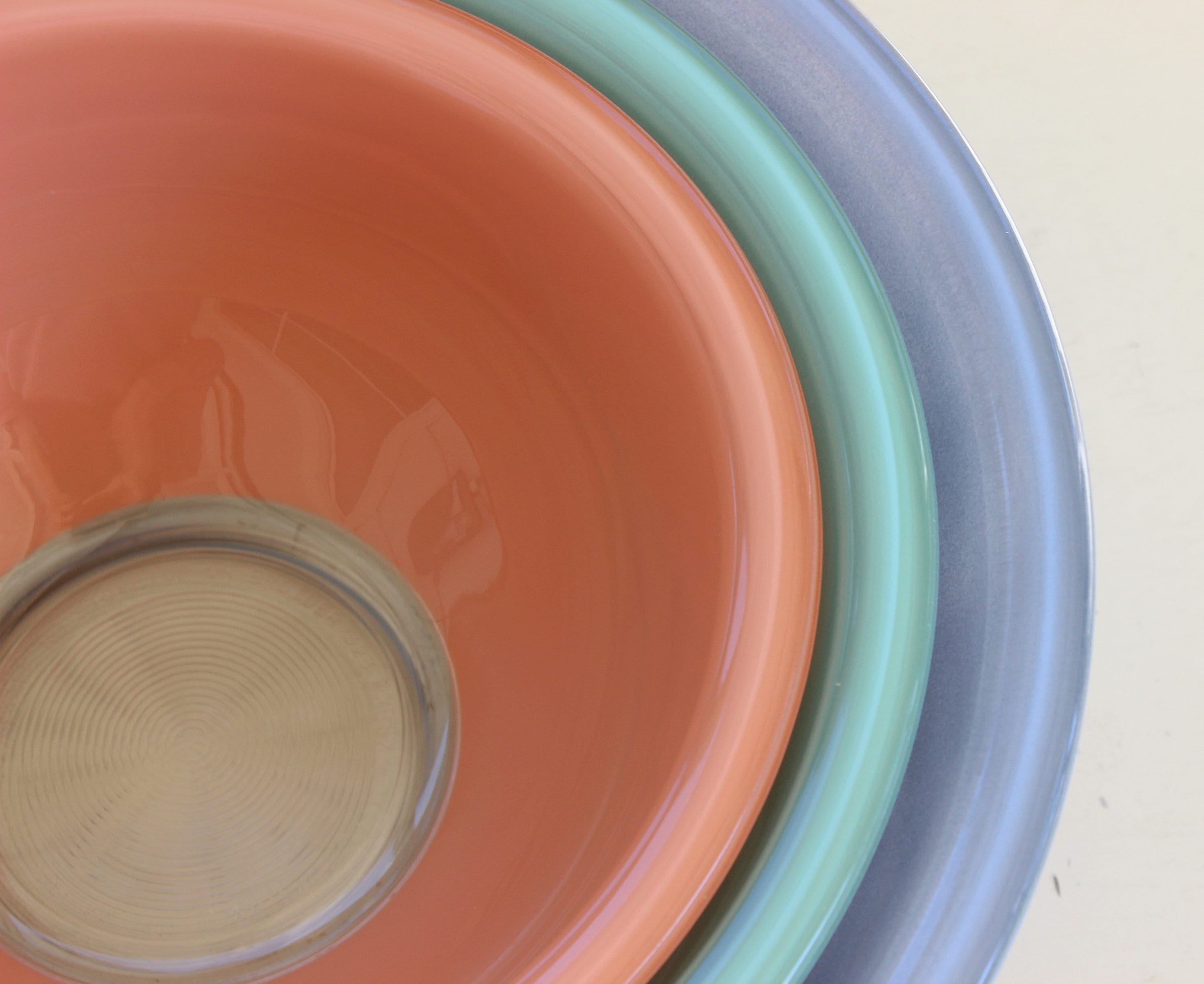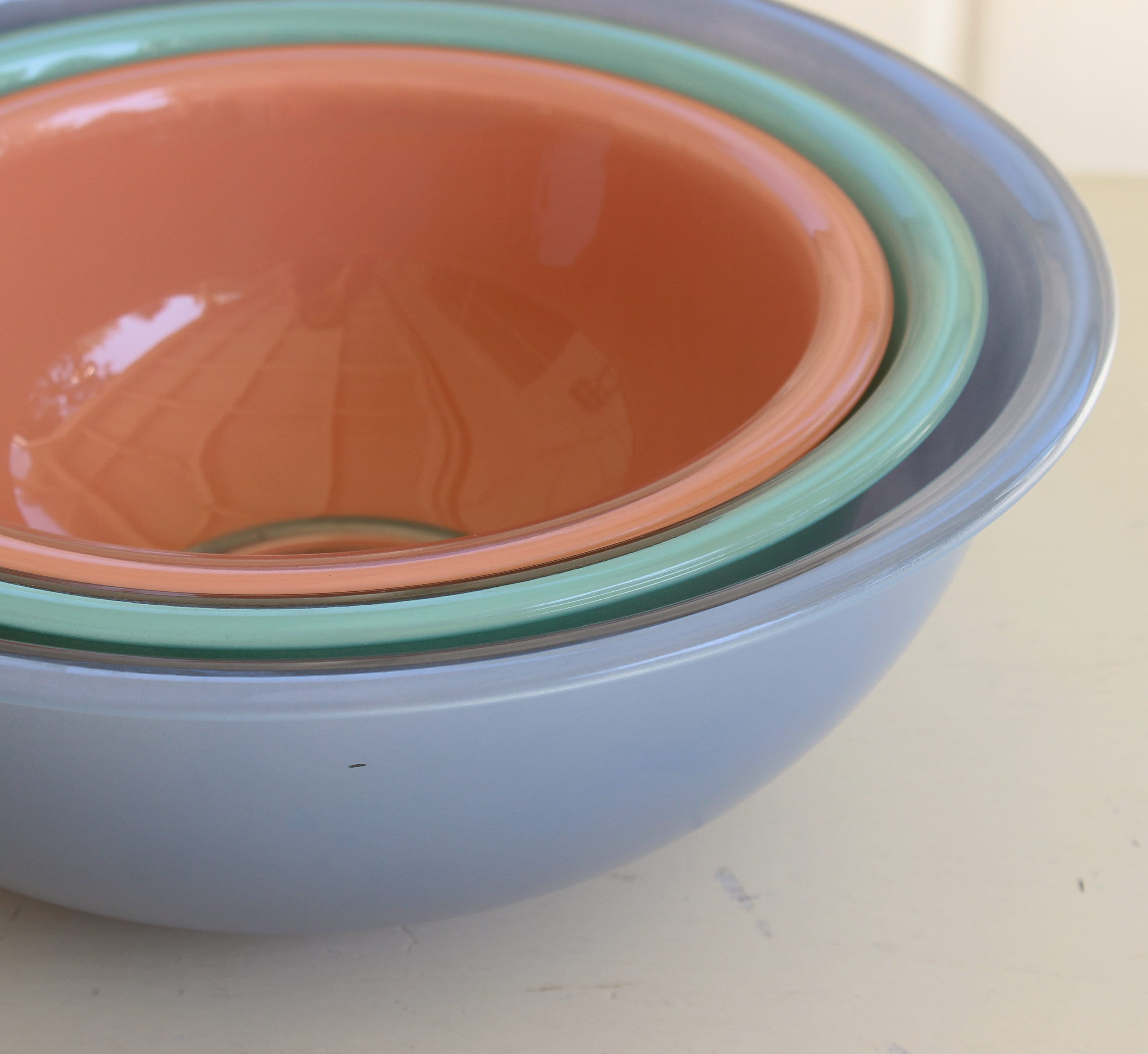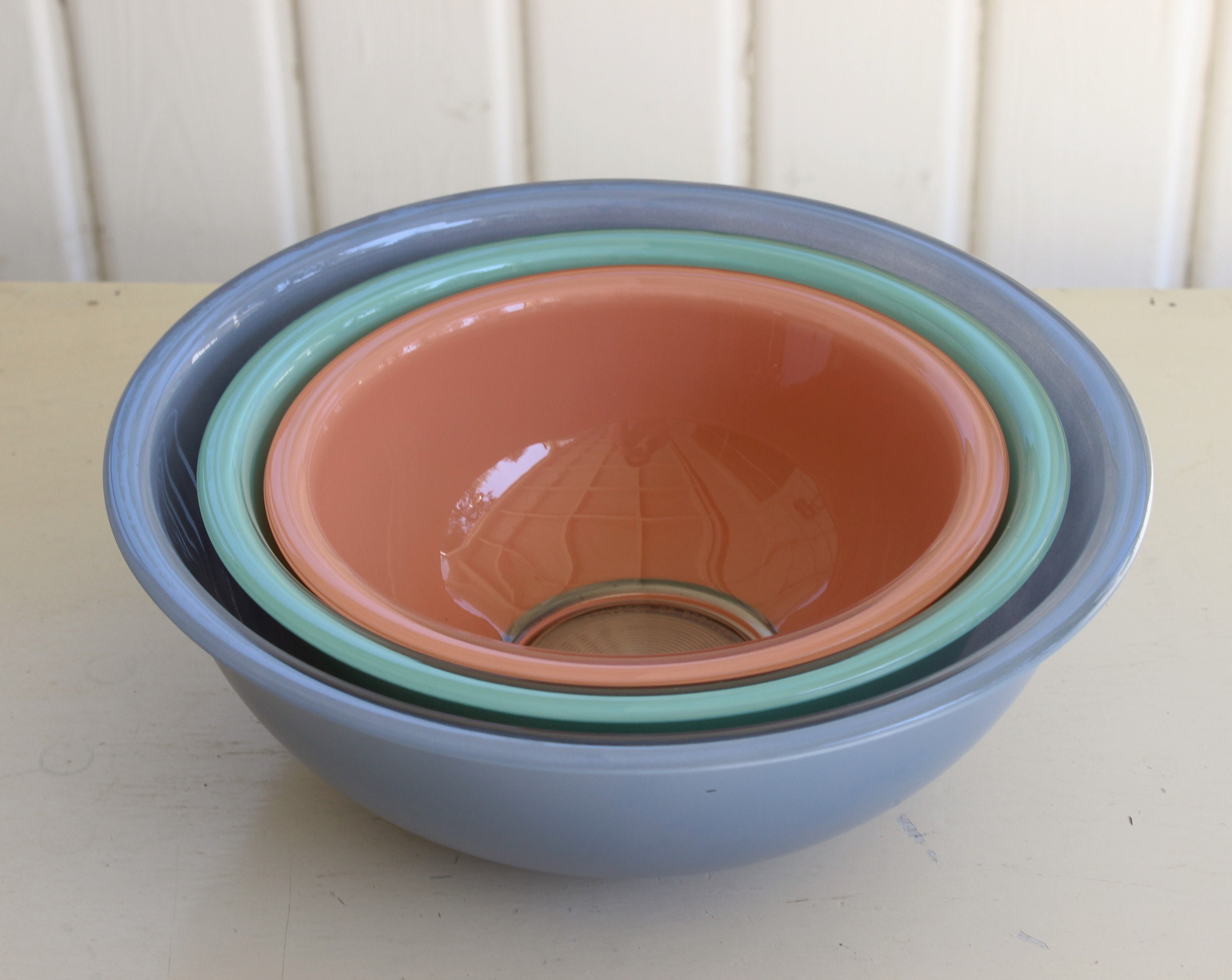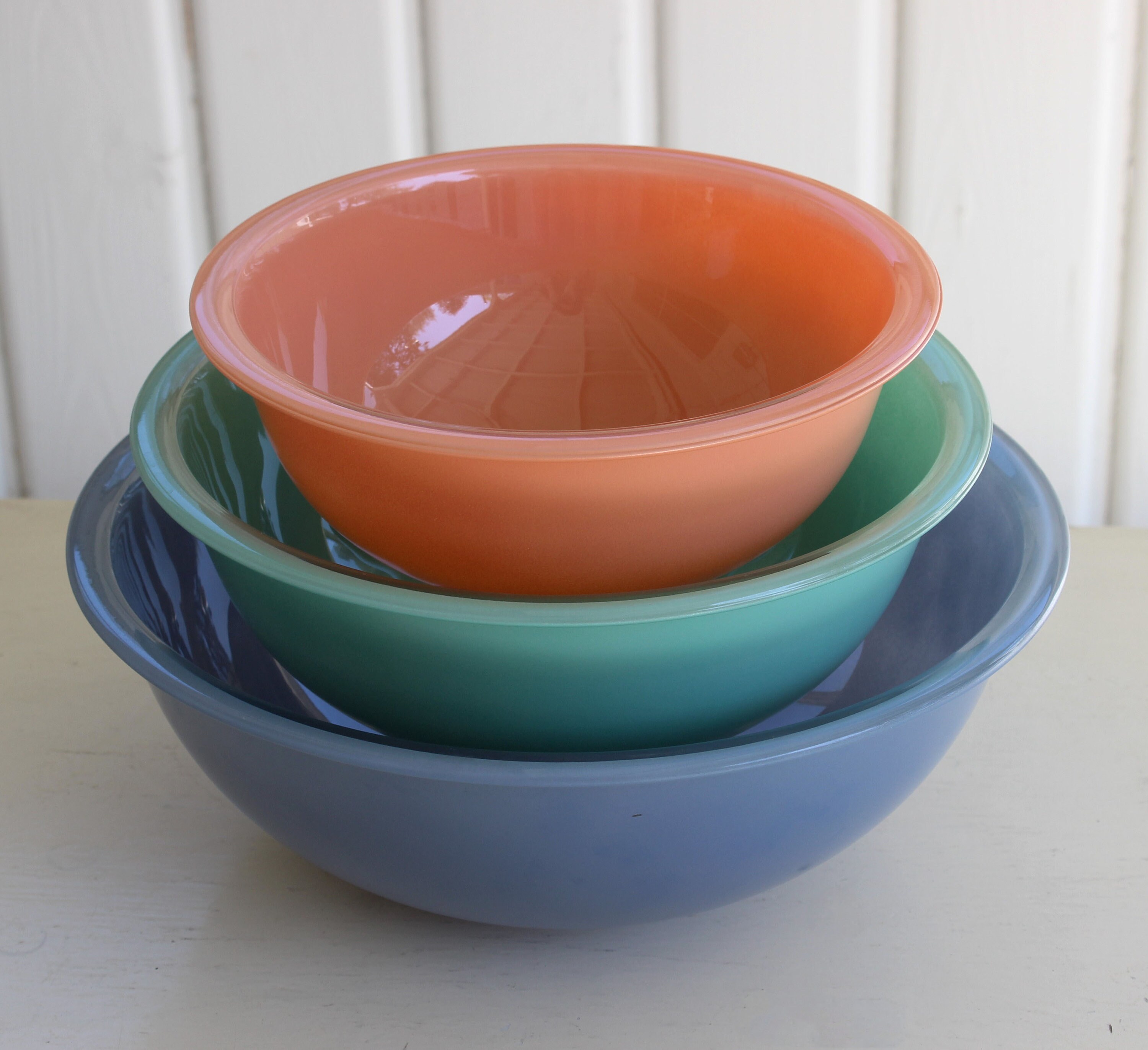 Set of VINTAGE PYREX MIXING/NESTING BOWLS in gorgeous pastel tones: PINK/SALMON, TURQUOISE BLUE, SKY BLUE. In excellent condition, these clear bottom glass bowls have very little wear. They are tow-tone, darker MATTE on the outside and lighter SHINY on the inside. The set is bright, cheery and perfect for a retro-inspired kitchen. Very minor scratches/paint loss. Set of 3 included.